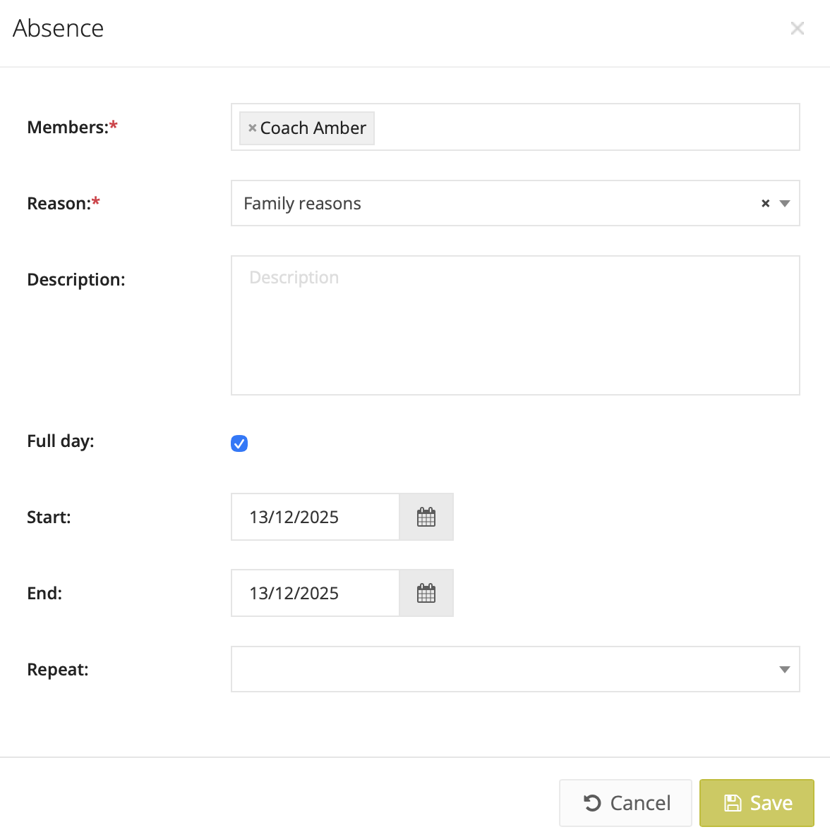 - Add an absence (e.g. holidays, illness), just like players already could.