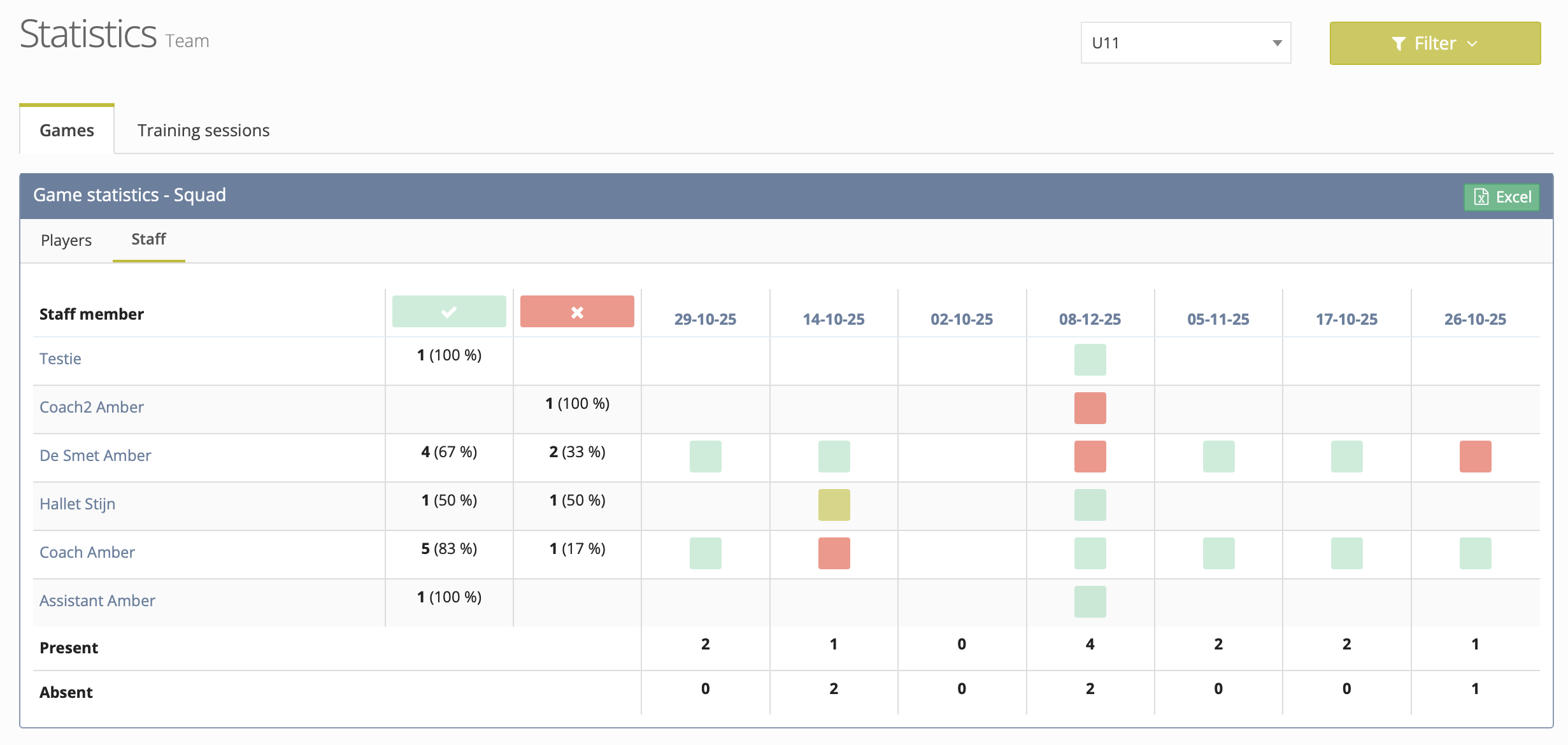 Staff attendance is now tracked and displayed in the Statistics module, just like player attendance.