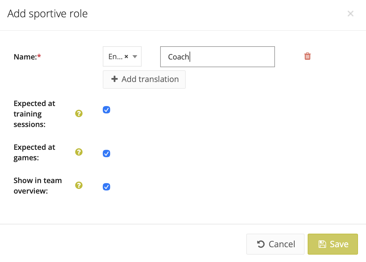 Coach role*: linked to training sessions and games