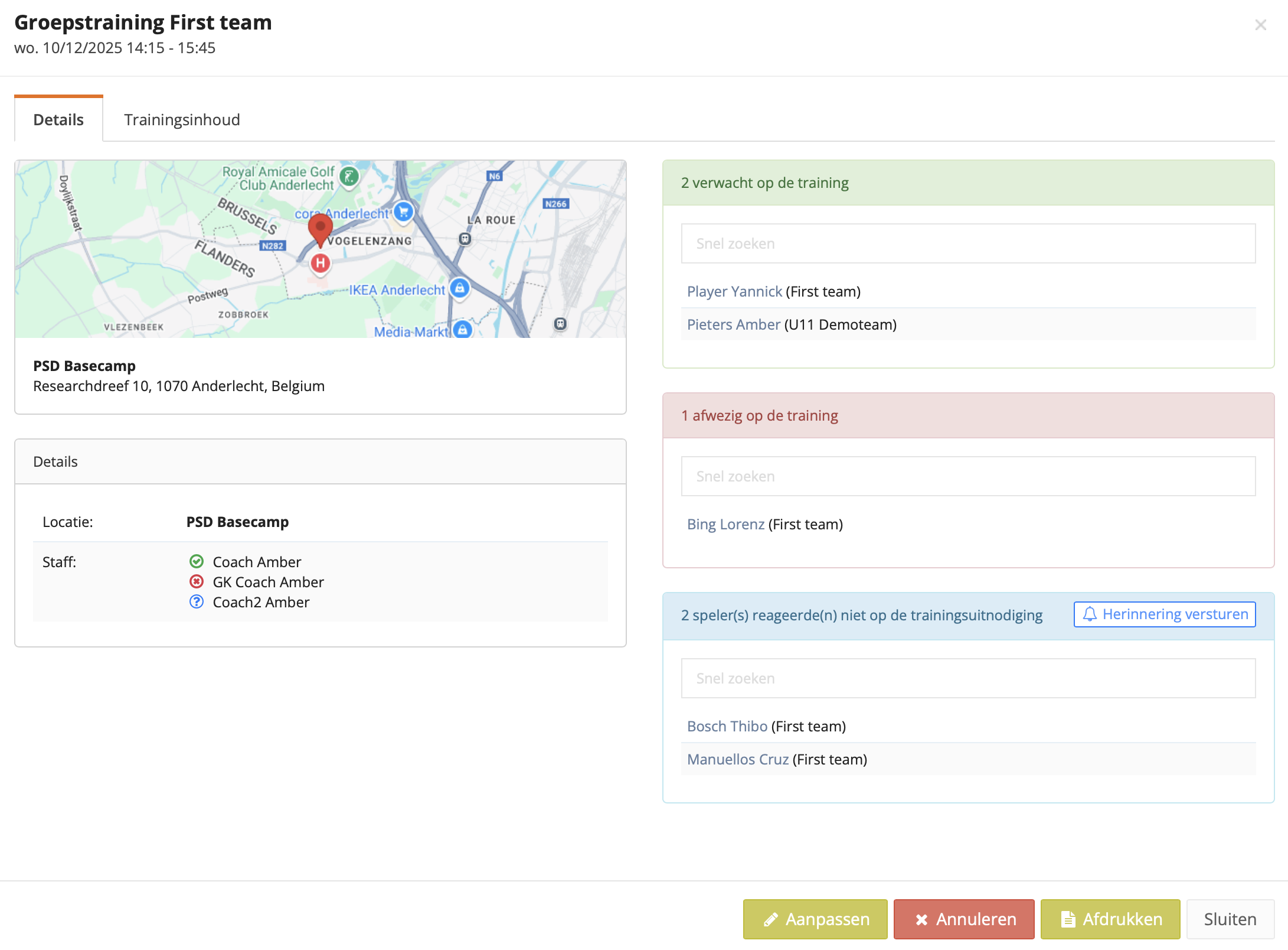 - Als staflid kan je ook een handmatige reminder sturen naar al je spelers die hun aanwezigheid nog niet hebben doorgegeven.