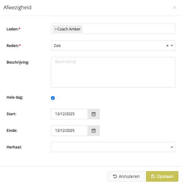 - Een afwezigheid toevoegen (bv. vakantie, ziekte), net zoals spelers dat al kunnen.