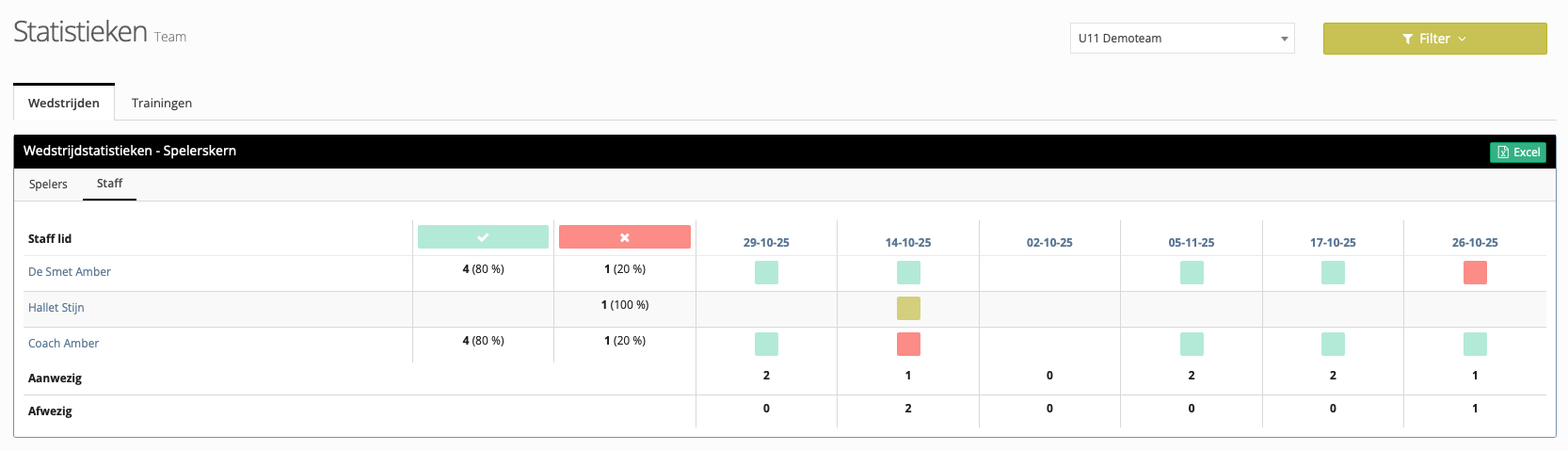 Ook worden de aanwezigheden van stafleden nu net zoals bij spelers bijgehouden en getoond in de Statistieken module.