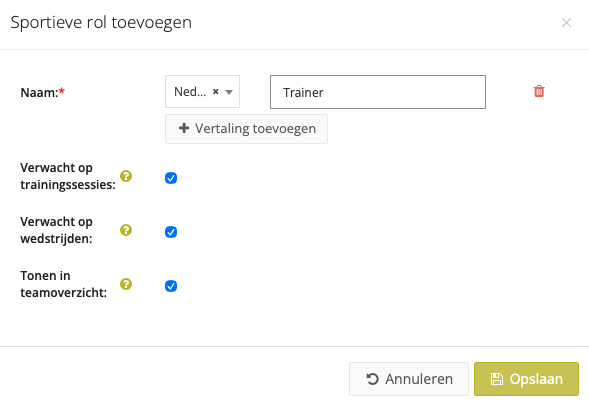 Rol trainer*: wordt gekoppeld aan trainingen en wedstrijden.